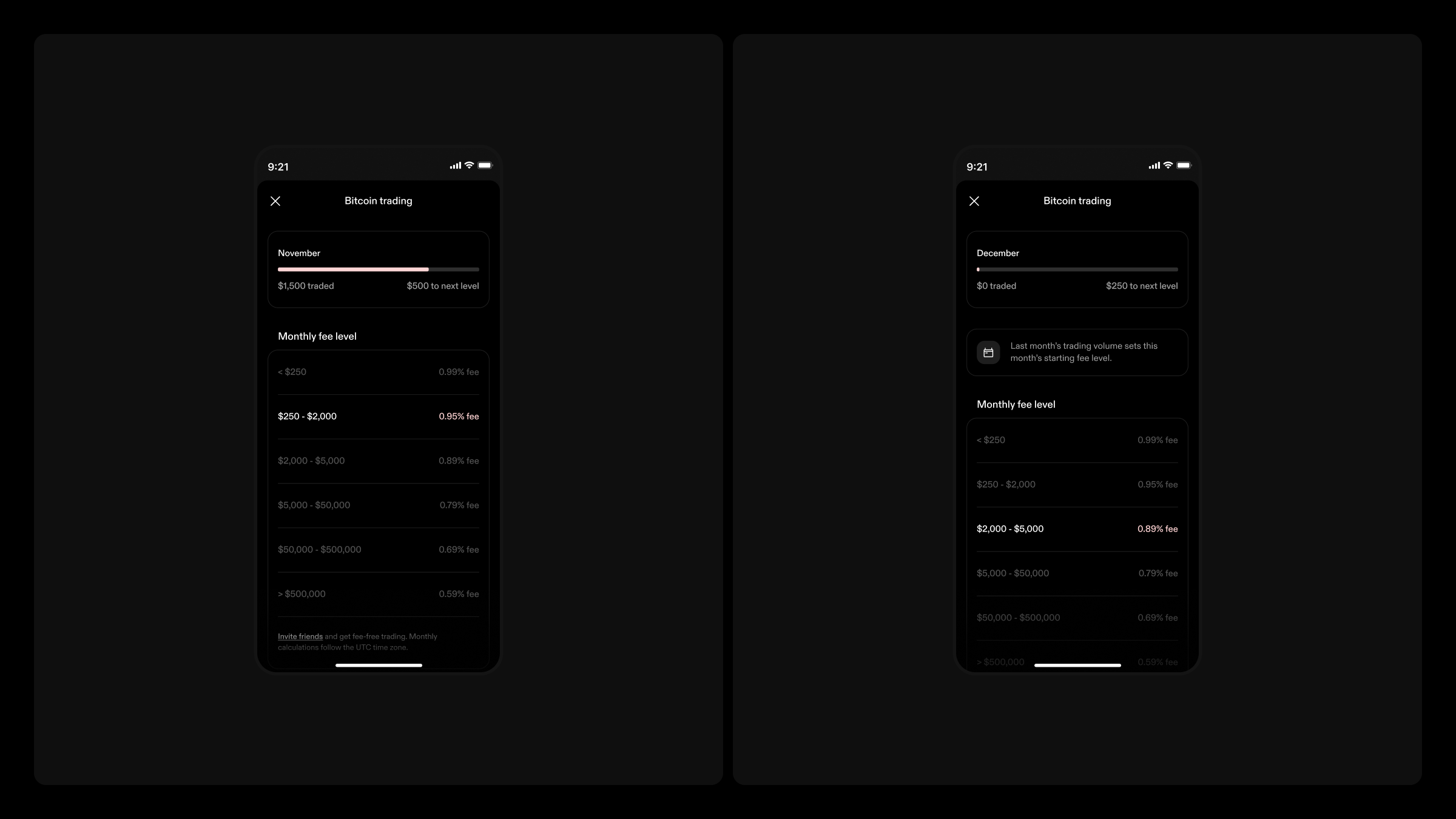 We transitioned to our current tier-based fee structure in February 2024. Since then, the fees you pay are displayed on the confirmation screen before you confirm a trade.